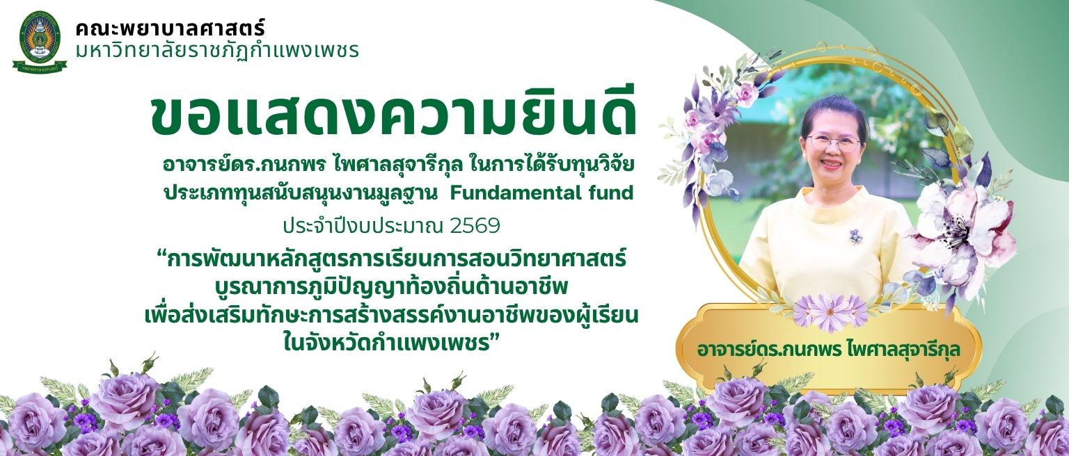 คณะพยาบาลศาสตร์ มหาวิทยาลัยราชภัฏกำแพงเพชร. (2568). ขอแสดงความยินดี อาจารย์ดร.กนกพร ไพศาลสุจารีกุล. สืบค้น 16 ตุลาคม 2568, จาก https://nurse.kpru.ac.th/?lang=TH&page_id=291