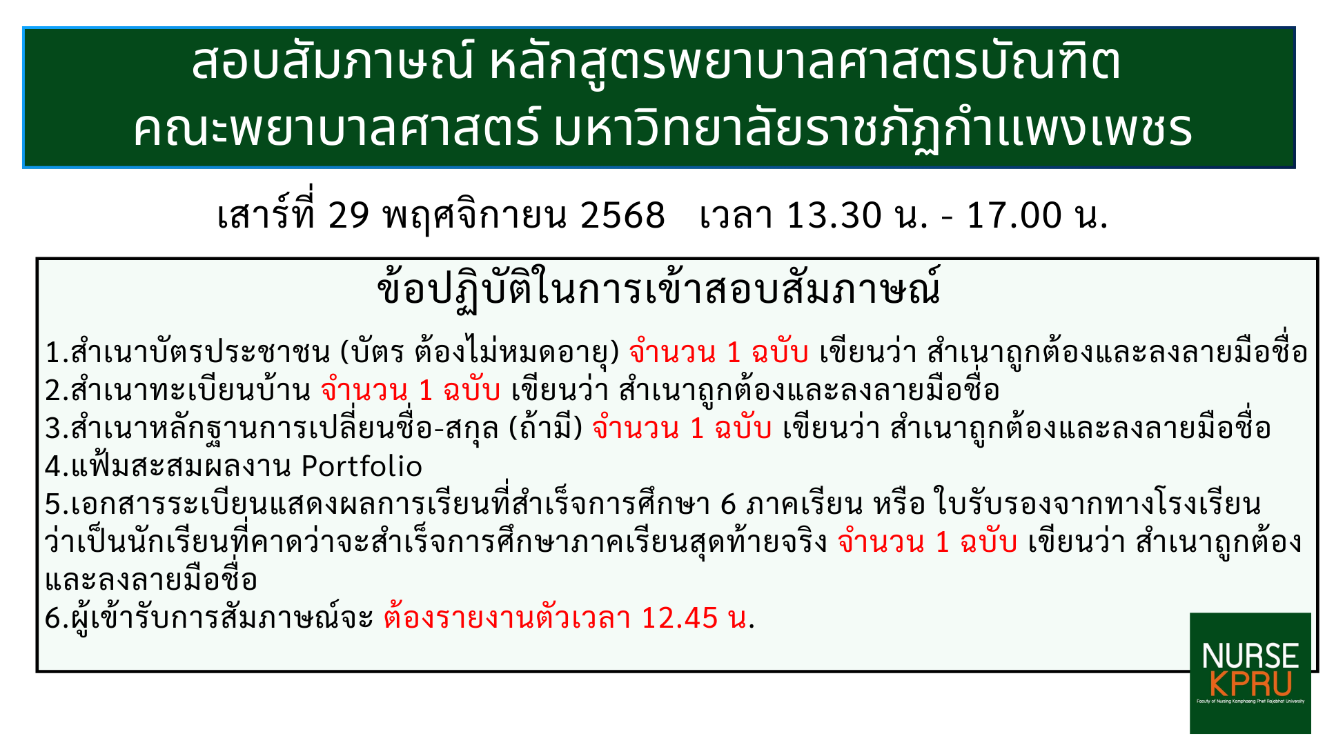 คณะพยาบาลศาสตร์ มหาวิทยาลัยราชภัฏกำแพงเพชร. (2568). สอบวัดความรู้ และ สอบสัมภาษณ์ นักศึกษาใหม่ รอบที่ 1. สืบค้น 2 ธันวาคม 2568, จาก https://nurse.kpru.ac.th/?lang=TH&page_id=305