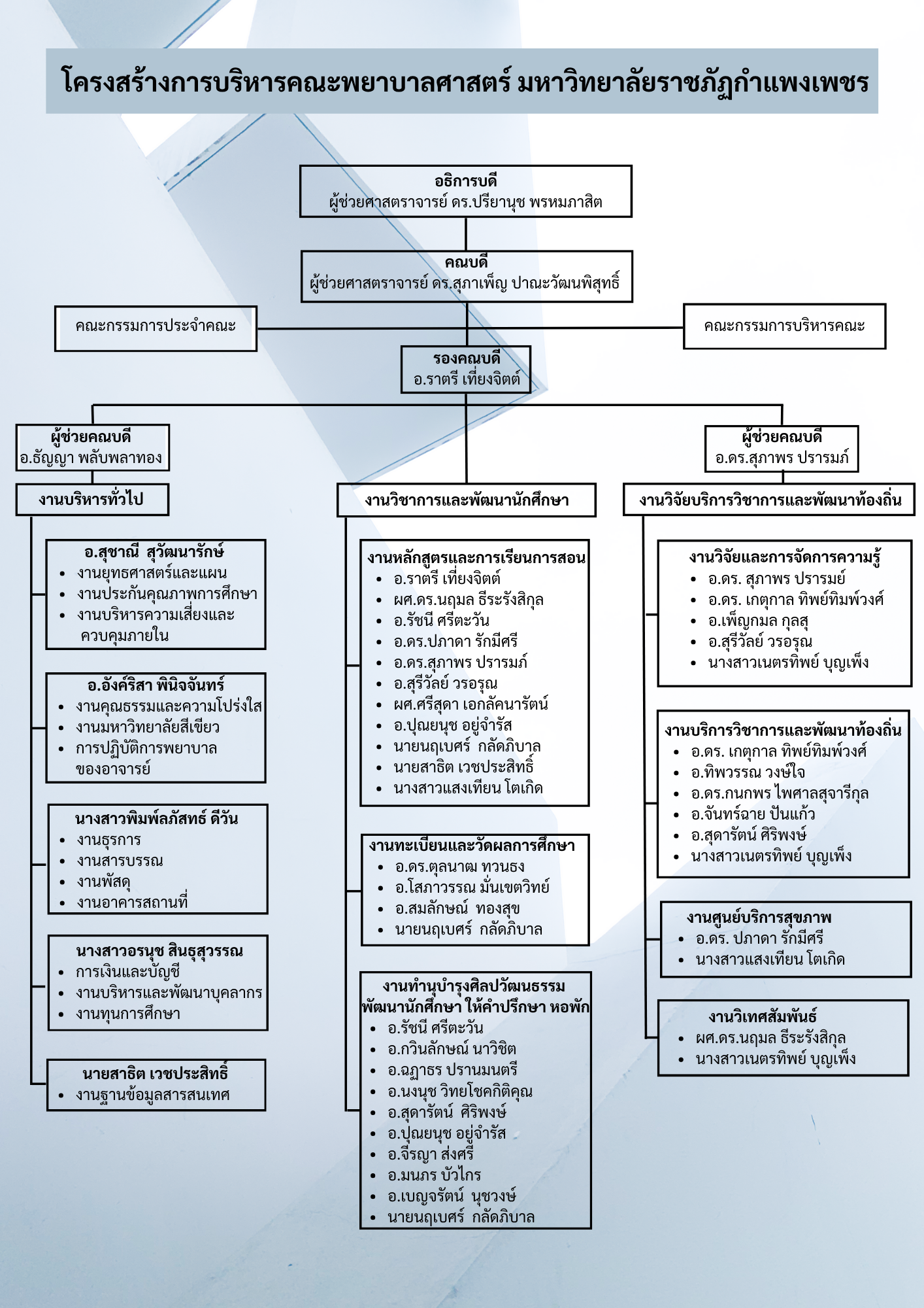 คณะพยาบาลศาสตร์ มหาวิทยาลัยราชภัฏกำแพงเพชร. (2565). โครงสร้างบริหาร. สืบค้น 25 พฤศจิกายน 2568, จาก https://nurse.kpru.ac.th/?lang=TH&page_id=80